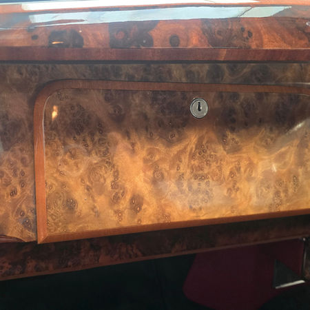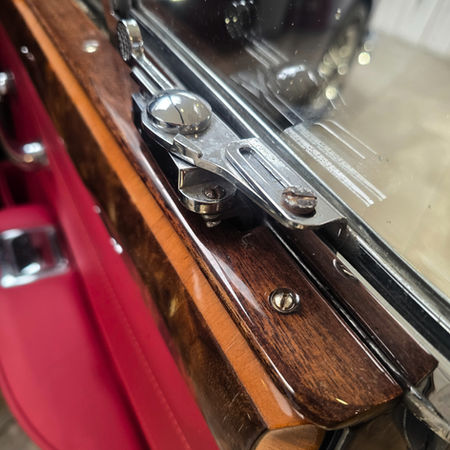 The car presented here is a very sound and genuine example, benefitting from a thorough, well-documented restoration carried out to a high standard. As part of this work, the car received a high-quality respray in an attractive classic navy blue, which suits the Daimler’s lines perfectly. The brightwork was re-chromed, the engine bay carefully detailed, and the interior fully refreshed with new carpets, a new red leather interior, and re-veneered woodwork, all of which contribute to a beautifully cohesive and period-correct cabin.